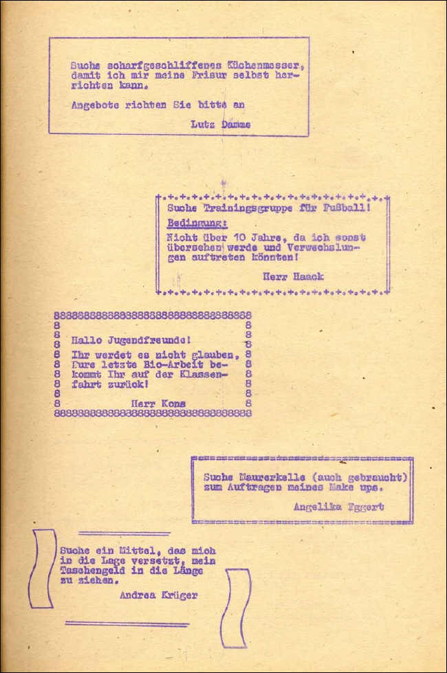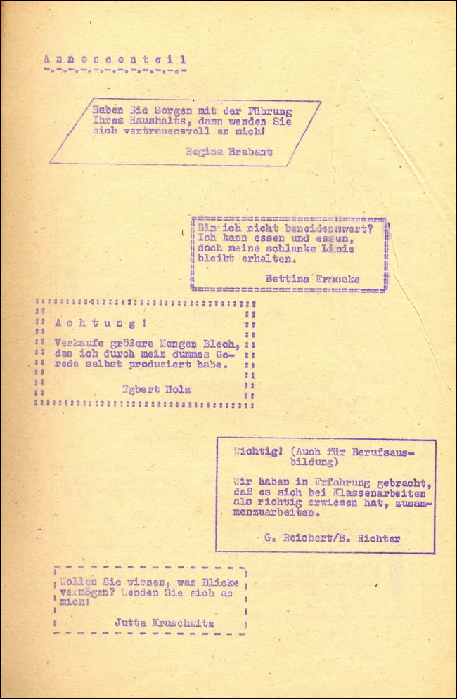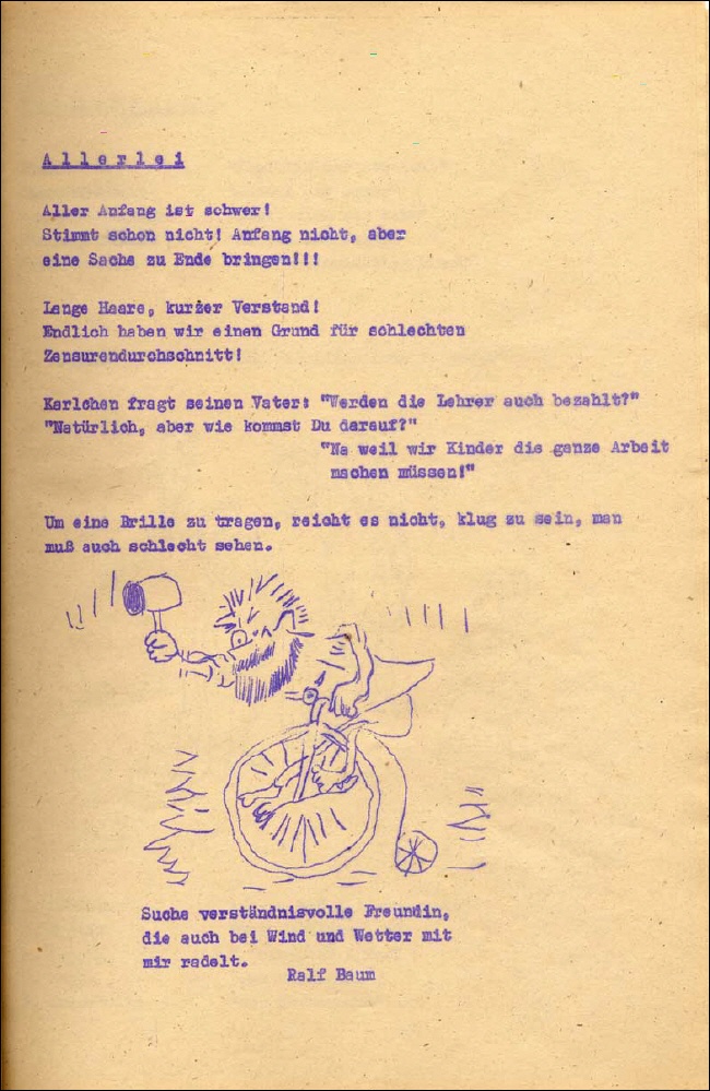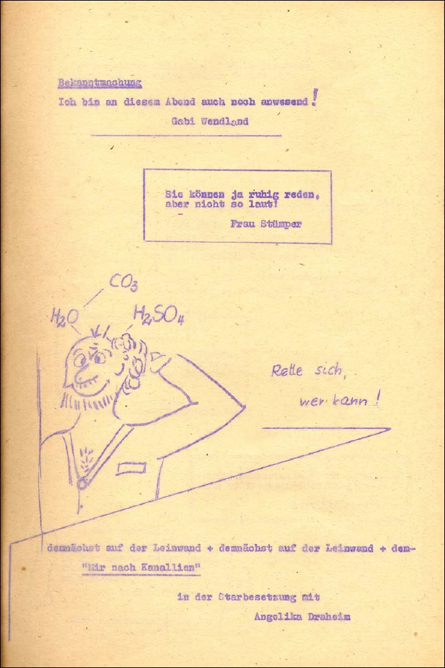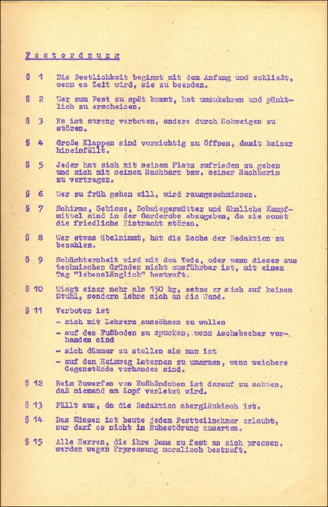 Hier also nun die Abschlußzeitung unserer Klasse aus dem Jahre 1975. Die Abschlußfeier fand im "Klub der Volkssolidarität" statt. Klickt einfach auf die Bilder. Vergrößern geht auch. Ihr müßt Euch also nicht die Augen verderben! |